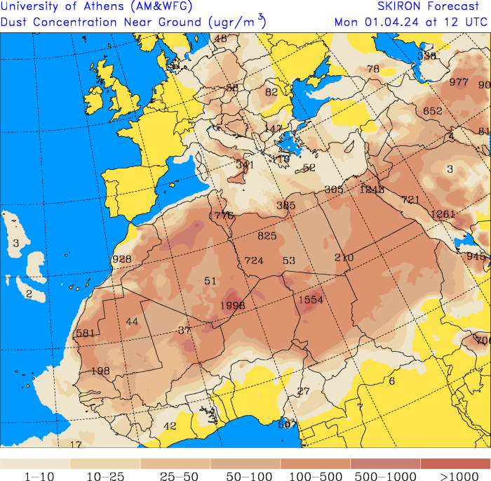 Scirocco che rinforza, in attesa che il vento pieghi a libeccio in serata con l'ingresso del fronte da ovest che su queste zone non produrrà granchè, ma se non altro ripulirà l'aria dalla sabbia.