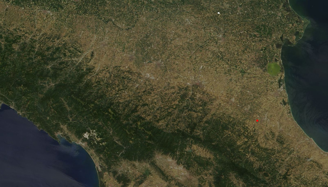Nell'immagine satellitare del 04/08/17, si può notare la forte siccità che attanaglia la regione: dovrebbe essere verde (come in Appennino), mentre è tutto marrone e bruciato (il puntino rosso è, più o meno, dove vivo).
