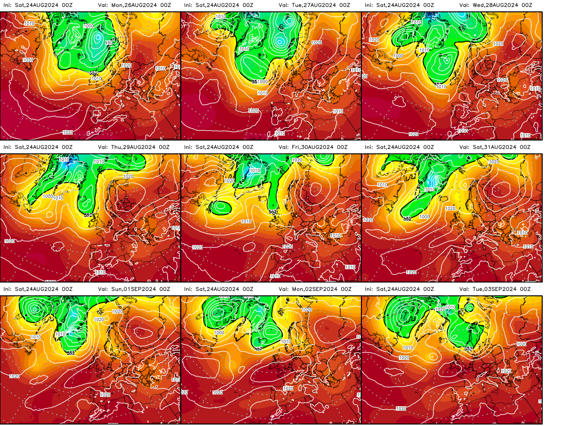 Sulle generali di fine mese e inizio Settembre qui l'evoluzione prospettata dai forecast ECMWF: quel che si nota è lo spostamento dei massimi di GPT in blocco verso nord, in un regime assimilabile ad un WR4 (EA-/SCAND+ come faceva notare Setra), con un ponte di blocco dall'Atlantico verso le alte latitudini e un'area mediterranea comunque soggetta a infiltrazioni secondarie, come più volte sottolineato: certo, ancora labili e blande, ma vedremo se dai primi di Settembre la situazione migliorerà in quest'ottica.