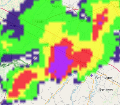 Ieri pomeriggio un violento sistema temporalesco accompagnato da grossa grandine, ha attraversato le colline faentine per poi scaricarsi sulla pianura forlivese seguendo una direzione SW-NE, colpendo soprattutto Villagrappa (FC), ad appena 3 km da casa, ma arrivando anche a colpire dove abito (come raccontatomi dal mio vicino), con chicchi molto grossi ma radi, a differenza di Villagrappa (FC) ed altre zone dove anche l'intensità è stata elevata.