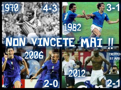 Suicidio tattico del fighetto Lowe, quando ho visto la forazione ero contento come un bimbo. Con Muller, Schurlle e klose dall'inizio sarebbe stata un'altra partita secondo me, invece il pistola pensava di coprirsi contro un centrocampo italiano nettamente superiore. Pensavano che la generazione U21 che vinse l'europeo fosse imbattibile, invece già quell'europeo lo vinsero con il fondoschiena, contro l'Italia fecero un golletto finale dopo che l'Italia passò in attacco 90' mangiando gol dopo gol. Questa sera una partita da vincere 3 o 4 a 0 ed umiliarli definitivamente.
