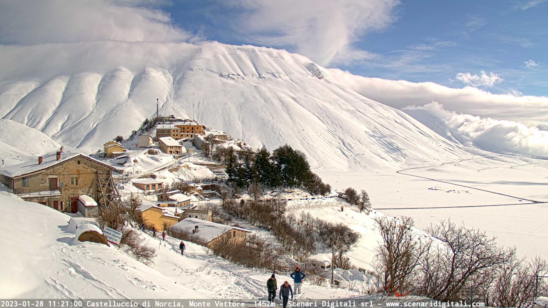 Attualmente +1,3° e cielo nuvoloso, cade debolissimo nevischio. Prima una buferetta un po' più convinta ha riimbiancato con un velo quasi tutte le superfici.