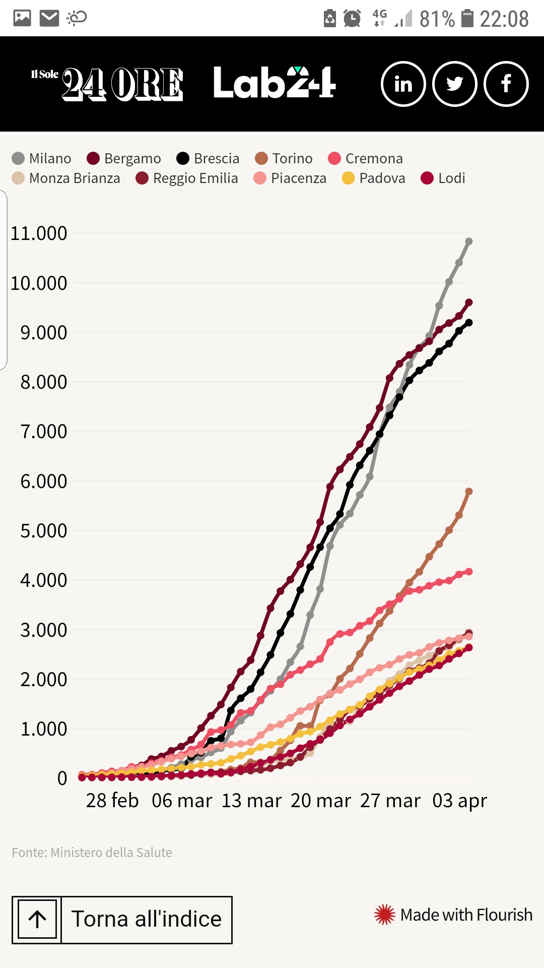 Non cito poi la provincia di MB (mi mancano gli ultimi due gg), anch' essa letteralmente esplosa nelle scorse settimane,  dopo l' iniziale fortuna dei pochissimi casi: lì,  maree di fabbriche e fabbrichette " " indispensabili " " non hanno chiuso, perdendo il fortunato vantaggio iniziale, visto che si trovano sulla strada fra le province di MI da una parte e BG/BS dall' altra.