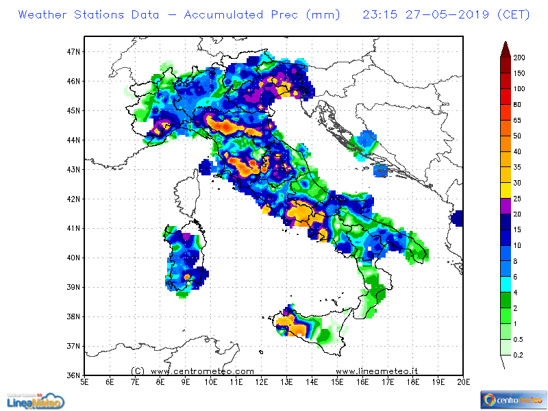 La giornata chiude con 34.2 mm, accumulo davvero importante, anche se non quello più alto del mese, che resta quello do domenica 19, e che porta il mese a 157 mm.