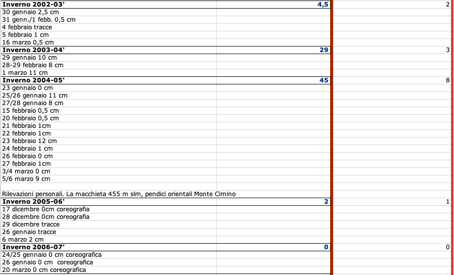 Possiedo/possediamo dati ormai di lungo periodo sulla nevosità del viterbese, per lo meno di alcune zone costantemente monitorate. Ad esempio per Soriano (dove ho casa in campagna) ho una serie storica costruita tramite un doppio contributo (da me dal 2005 e da un caro amico meteoappassionato che risiedeva lì dal 1988 al 2005).