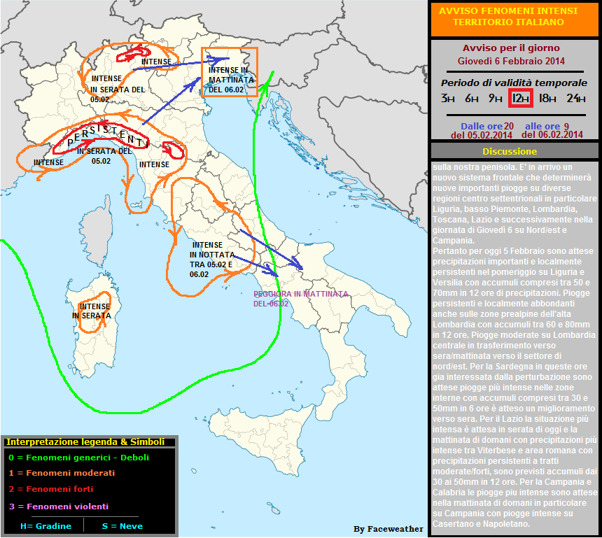 PER LA NOTTE E PRIME ORE DEL MATTINO DEL 6 FEB.2014 - migliora su nord/ovest e Sardegna con ampie schiarite, piogge intense interesseranno invece Lombardia, Friuli, Veneto, Emilia, Toscana e Lazio. le precipitazioni piu intense si avranno su Veneto centro occidentale, Toscana orientale, Umbria, Lazio con precipitazioni localmente persistenti e possibilmente anche a carattere di Temporale in particolare su Lazio, Umbria e Veneto su queste zone possibilità di accumuli compresi tra 20/40mm in sole 5 ore. Peggiora anche su Abruzzo, Marche, Molise, Campania e Puglia settentrionale.