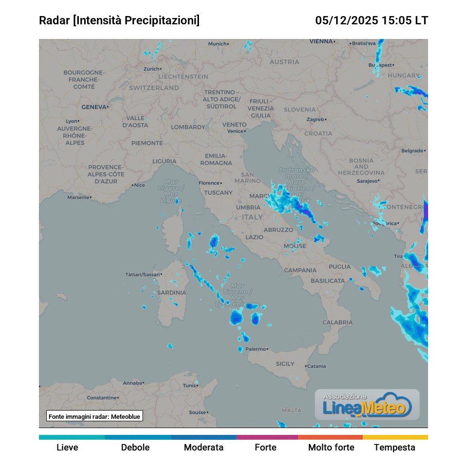 A seguito dei recenti problemi avuti dal radar del DPC, e anche dalla decisione del nostro vecchio fornitore di abbandonare il progetto, abbiamo stabilito una nuova collaborazione commerciale con Meteoblue, che da oggi ci garantirà appunto una nuova copertura del servizio.