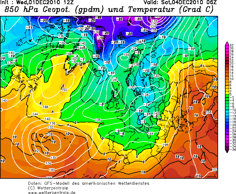 Termiche da una -1°C in calo ad una -4°C a 850hpa; -30/32 a 500hpa,