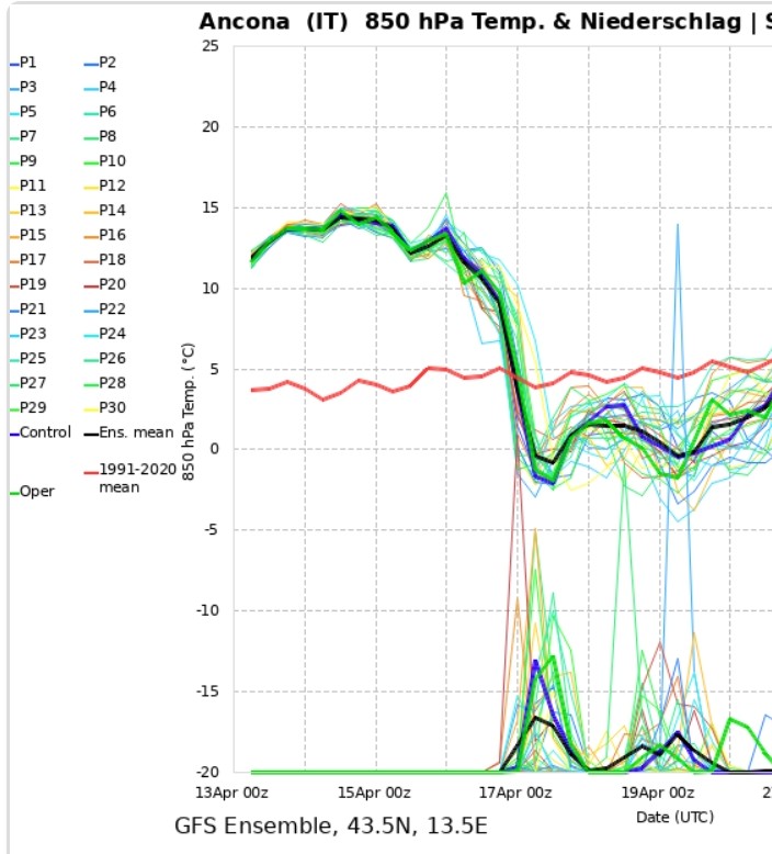 Intanto allego gli spaghi di Ancona, dove per qualche ora agli 850hpa si potrebbe andare in cifra negativa