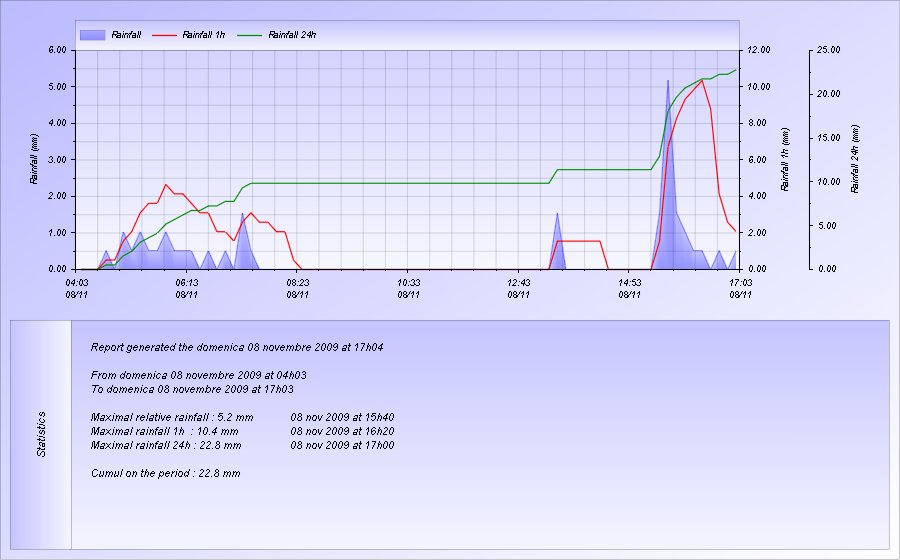I mm totali sono 22.8, di cui 12 (e molto sottostimati) durante la grandinata, con la temperatura scesa a 7.4°C.