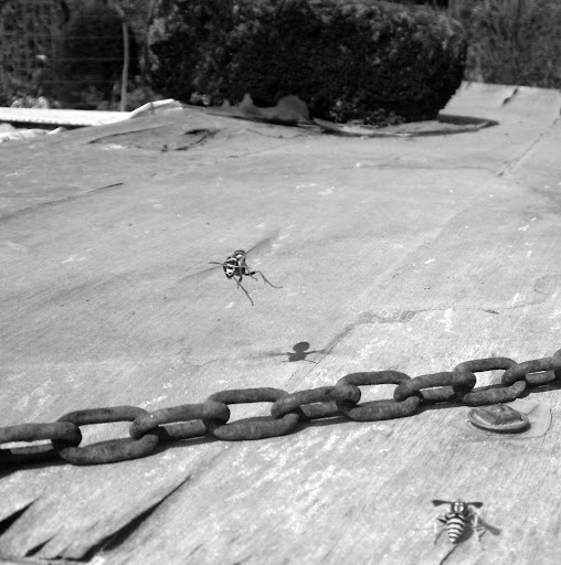 Forse avrei fatto un crop sulla parte alta che distoglie un po' dal particolare della foto... molto bella comunque... la catena, l'ombra dell'ape in alto in volo... bravo!
