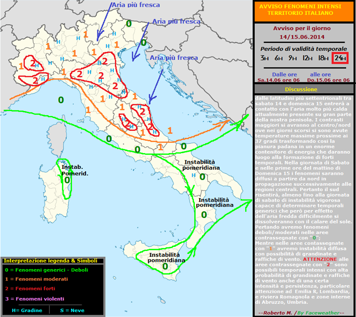 Nella giornata di Sabato l'aria piu fresca affonderà sull'Italia valicando le Alpi determinando cosi un crollo termico; la situazione barica al suolo subirà un ulteriore modifica andando cosi a creare un minimo depressionario sul Golfo Ligure che richiamerà aria piu umida dal settore adriatico, questa situazione creera un'area di convergenza che darà luogo a una forte spinta dai bassi strati in quota dando cosi luogo alla possibilità di groppi temporaleschi consistenti specie su Emilia, Veneto, Lombardia meridionale.
