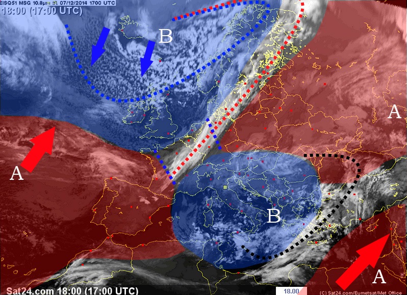 La prima, in alto a sinistra, è la “solita” depressione islandese, che sta inviando, proprio in questi momenti, un fronte freddo sul Regno unito (linea tratteggiata blu) preceduto, come da manuale, da un fronte caldo (linea tratteggiata rossa) presente su Francia, Paesi Bassi, Germania e Repubbliche Baltiche.