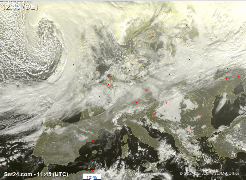 Allorché i raggi solari hanno vinto il primo terreno, la retroazione positiva che si innesca (crollo locale dell’albedo, forte aumento dell’assorbimento di calore) è tale da innescare un processo di erosione concentrica della nebbia a progressione esponenziale. Abbiamo cercato di diagrammarne la dinamica impiegando i fotogrammi odierni del satellite geostazionario (EUMETSAT) a passi di 15 minuti.