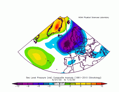 sul 3 e 4 luglio compare sempre il blocco basso pressorio, che con Anticiclone delle Azzorre sull'Europa dovrebbe invece essere assente, tra l'altro continua ad essere visibile il bipolo descritto seppur un poco più alto di latitudine ma è normale nelle configurazioni ibride, tuttavia la reanalisi secondo me non evidenzia un 5° pattern di questo tipo e quindi le ritengo espressioni dello schema barico europeo come descritto :