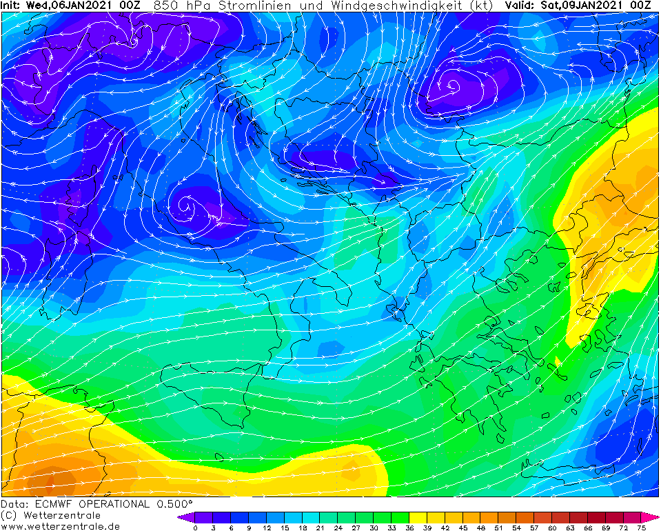 Qua linee di flusso a 850hpa. Notare poi da classici spaghi come nelle prossime 36 ore impennino le temperature in quota (500hpa), ma non in basso .