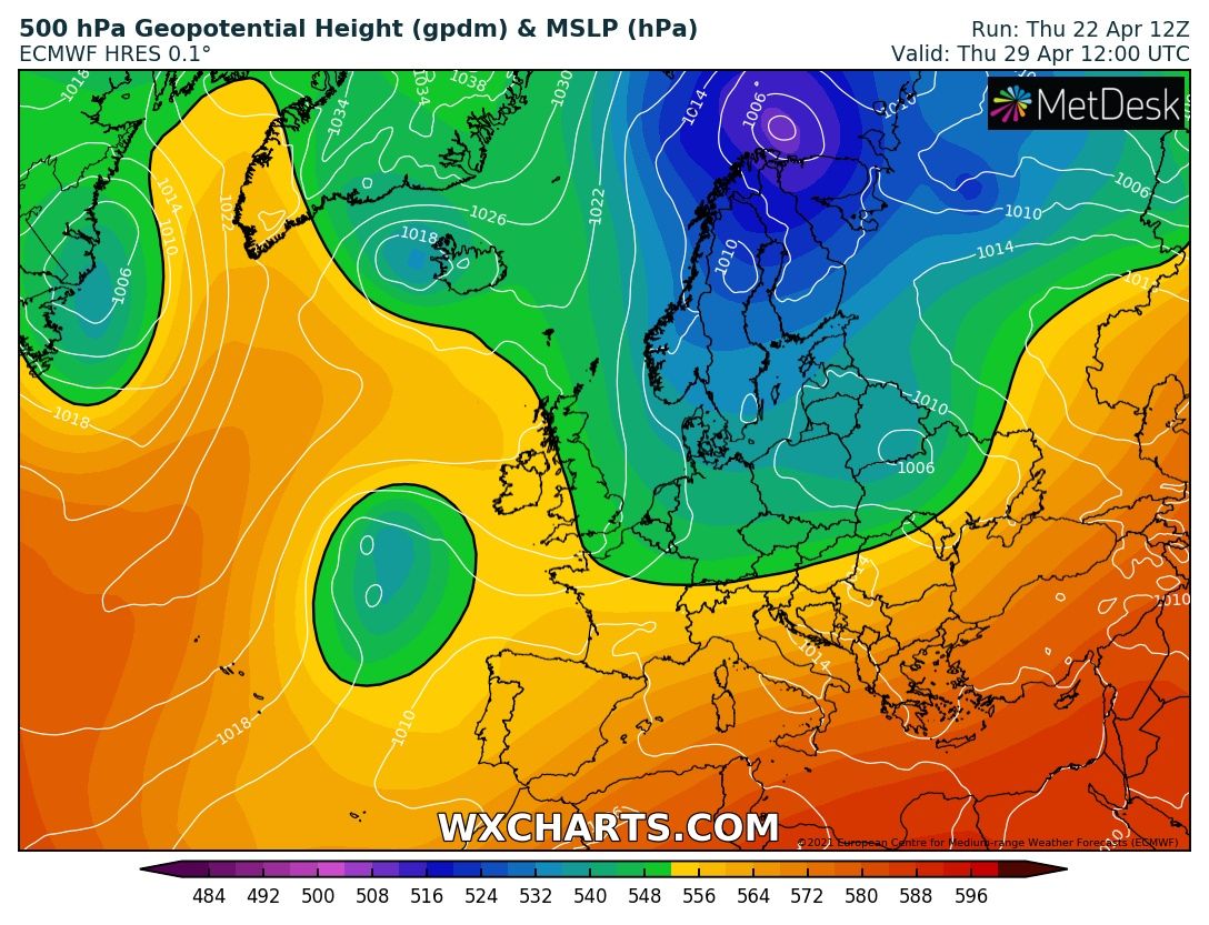 Poi sembra ancora scorgersi l'ipotesi di una nuova falla al largo dell'Iberia ed elevazione di un promontorio per fine mese e inizio Maggio. La saccatura intanto risale verso più alti paralleli (in 2' carta lo stretching del minimo)