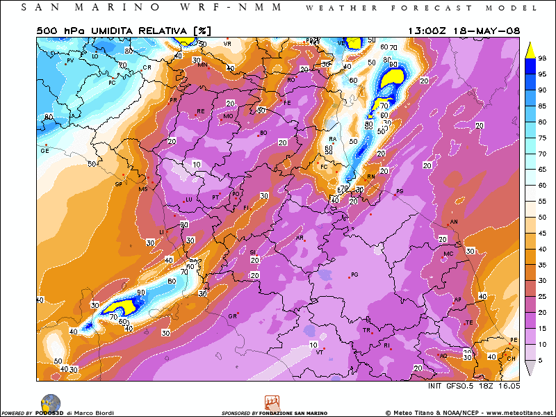 Non è proprio una questione di resistenza anticiclonica o vento forte (che al suolo non sembra esserci), tra l'altro 1005 mb al suolo e 5600 scarsi in quota non sono da HP, la causa essenziale è una "bolla" di aria non tanto calda, anzi abbastanza fresca, ma secca tra i 2000 ed i 6000 metri di quota. Comunque io non dispererei del tutto, ad esempio il LAMMA ha aumentato l'umidità a 700 hPa nel proimo pomeriggio di domani fino al 60-80% tra aretino e perugino. C'è margine per qualche locale rovescio, anche temporalesco.