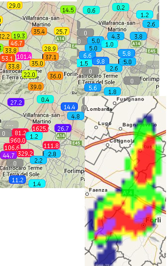 Spettacolare temporale tra Forlì e Faenza con Villagrappa (FC) colpita in pieno da una raffica di vento a ben 101,4 km/h ed un rain rate a 329,2 mm/h (altri rain rate più alti sono sintomo, probabilmente, di grandine). Accumulati 9,8 mm.