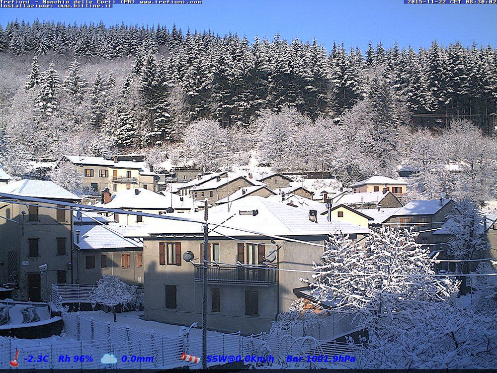 Cielo quasi nuvoloso, vento assente ma con raffica, nella notte, a 43,5 km/h, imbiancato sopra quota 400 m. (ma con neve caduta sino a 230 m. ed acquaneve che ha raggiunto almeno quota 140 m.), temperatura minima di +4,7°c ed accumulo piovoso totale di 47,0 mm (38,0 mm ieri + 9,0 mm oggi).