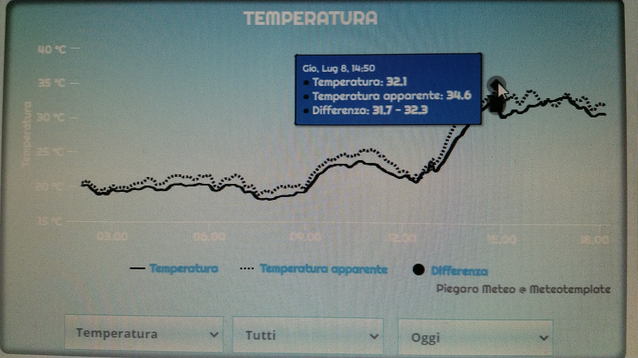 33,5 di massima oggi. Avevo registrato 33,7 mentre avevo aperto i piatti per pulirli poco prima delle 3 ma ho corretto il dato perchè evidentemente influenzato dall'irraggiamento diretto. A me sembra sempre leggermente sovrastimato il mio dato delle massima, anche se guardando Perugia centro non sembrerebbe, oppure le stazioni di Piegaro (entrambe ma quella "bassa" in particolare) sottostimano decisamente registrando spesso massime più basse della mia oltre 100 metri più in alto, cosa che non accadeva gli scorsi anni. Delle due l'una, o entrambe. Secondo me c'è un "correttivo" nella stazione di Piegaro che riduce le massime, cosa vuol dire "temperatura apparente" secondo voi? Ecco il sito: