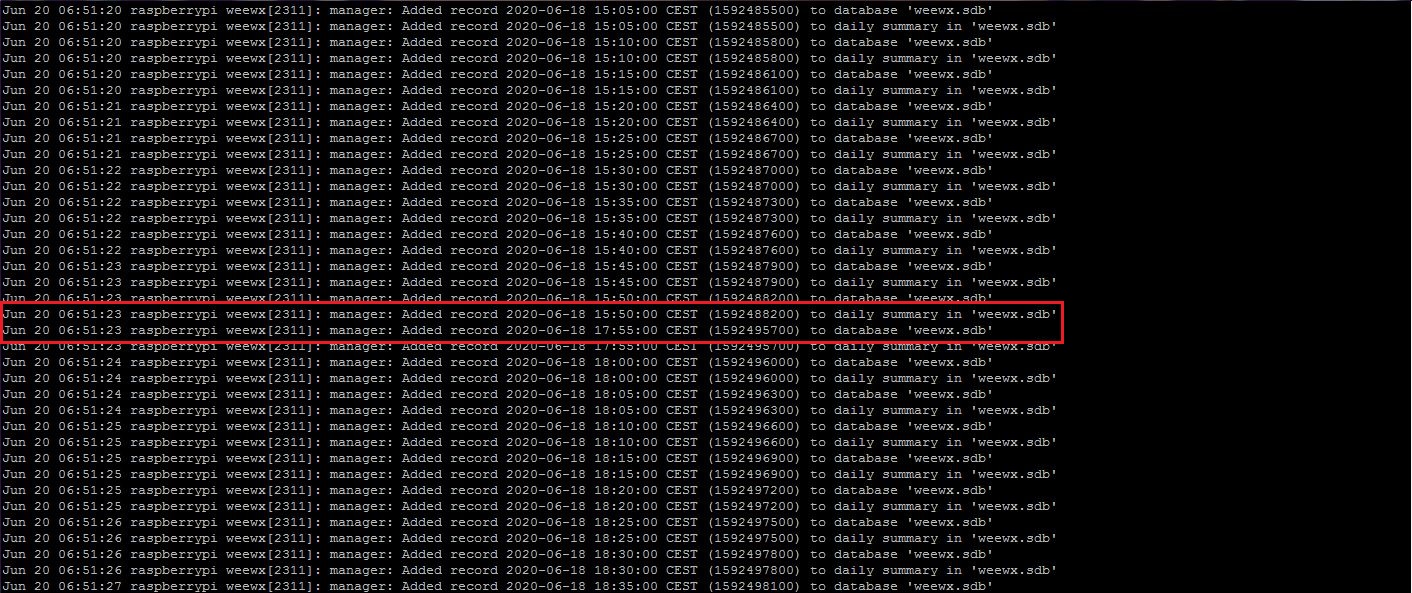 Questo è accaduto dopo le 17:50 del 18/06/2020 (verificato nella immagine allegata) e questo ha influito sulla data ed ora della stazione che quindi ha effettivamente memorizzato dei dati sul datalogger ma con timestamp uguale a dati che aveva già memorizzato in precedenza(da timestamp 1592471700 a 1592478600). Il loop di weewx non li ha aggiunti all'archivio perchè giustamente la data ed ora erano di questi dati erano antecedenti a quelli già presenti nel database e questo ha creato il buco visibile dalle 15:50 alle 17:55 del 18/06/2020 (dal timestamp 1592488200 a 1592495700) e verificato nelle immagini allegate nei post precedenti.