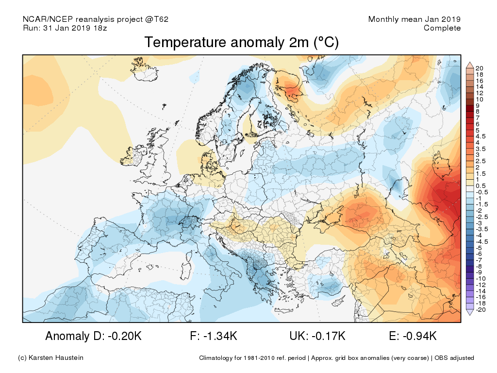 Temperature medie nel gennaio 2019 nelle stazioni AM e relativo solito confronto con le medie 1971-2000.