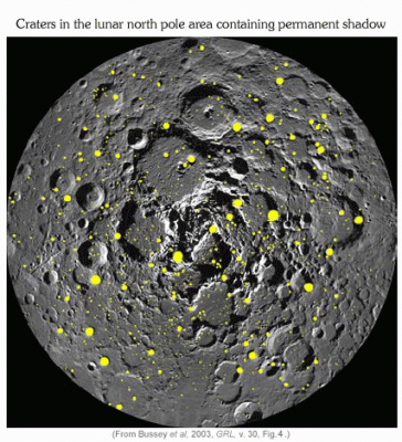 Si stima che solo intorno al polo nord lunare ci siano circa 7,500 km2 di crateri in ombra perenne ricoperti da acqua ghiacciata.