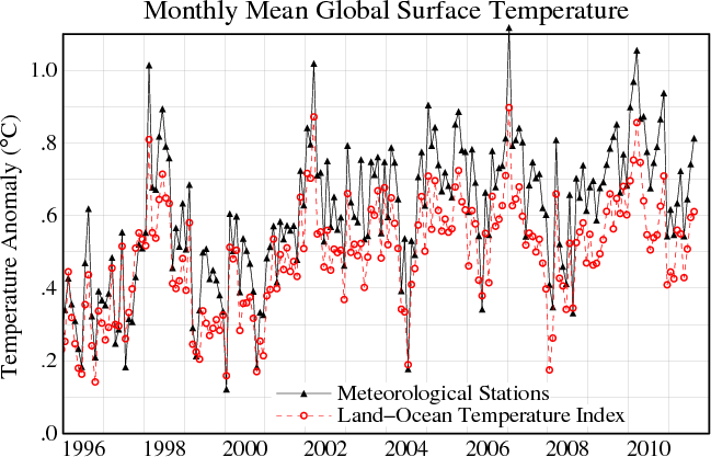 La temperatura media dell’aria e della superficie nel gennaio-ottobre 2011 è stata di 0,41 °C superiore rispetto alla temperatura media annuale del periodo 1961-1990, che a sua volta è pari a 14 °C (il dato di quest’anno è suscettibile di un errore in più o in meno pari a 0,11 °C).