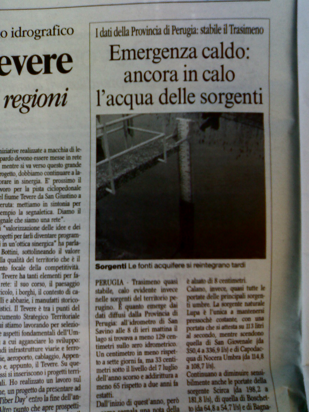 Ma dato che abbiamo buoni contatti con gli organi di stampa, non sarebbe il caso di far scrivere un articolo più approfondito, su come è possibile che sorgenti e lago calino anche in un anno così piovoso e nemmeno troppo caldo? Voglio dire, bastano i primi 2 giorni di caldo per far gridare all'allarme? Nessuno si è accorto che il problema c'era già 2 mesi fa, in pieno giubilo di pioggia?